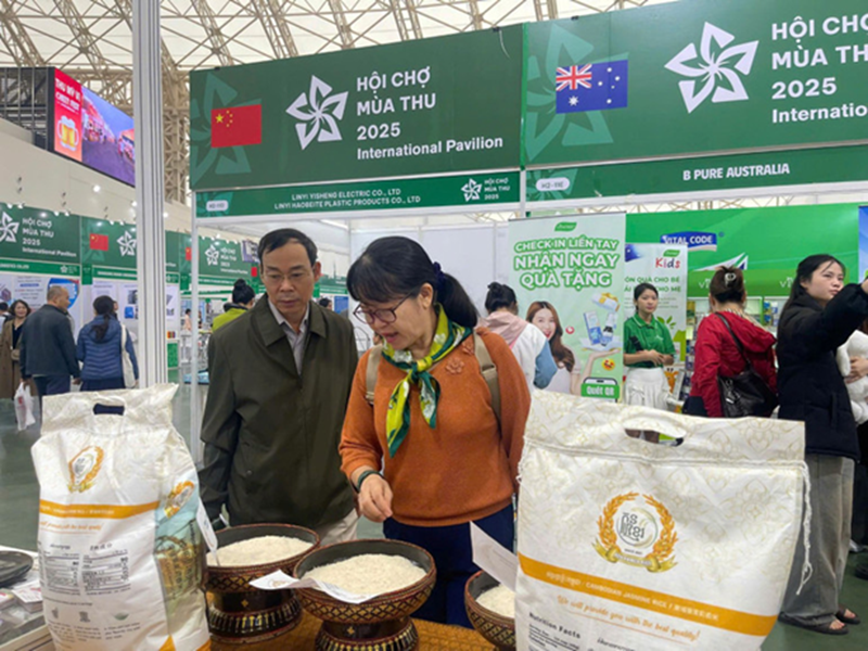 Không chỉ thu hút doanh nghiệp trong nước, Hội chợ Mùa Thu 2025 còn trở thành “cầu nối” giao thương quốc tế. Giữa khu nông sản-thực phẩm, gian hàng của Công ty Gạo Kon Khmer (doanh nghiệp chuyên phân phối gạo Campuchia tại thị trường Việt Nam) luôn thu hút đông khách.