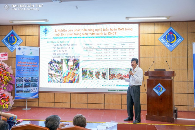Bên cạnh báo cáo kết quả Dự án giai đoạn 2022-2025 và kế hoạch tiếp theo, Hội thảo cũng được nghe báo cáo quan trọng về nguyên lý, nghiên cứu, phát triển và ứng dụng mô hình nuôi tôm thẻ chân trắng siêu thâm canh theo hệ thống tuần hoàn kết hợp đa loại (CTU-RAS) do ĐHCT chủ trì, phối hợp với nhiều đơn vị, cơ quan, công ty triển khai trong suốt thời gian qua. Mô hình CTU-RAS là mô hình nuôi tôm công nghệ cao, thân thiện môi trường, an toàn sinh học, an toàn thực phẩm; là nền tảng phục vụ cho đào tạo, nghiên cứu và phát triển thời gian qua cũng như đáp ứng nhu cầu mới trong xu hướng mới.