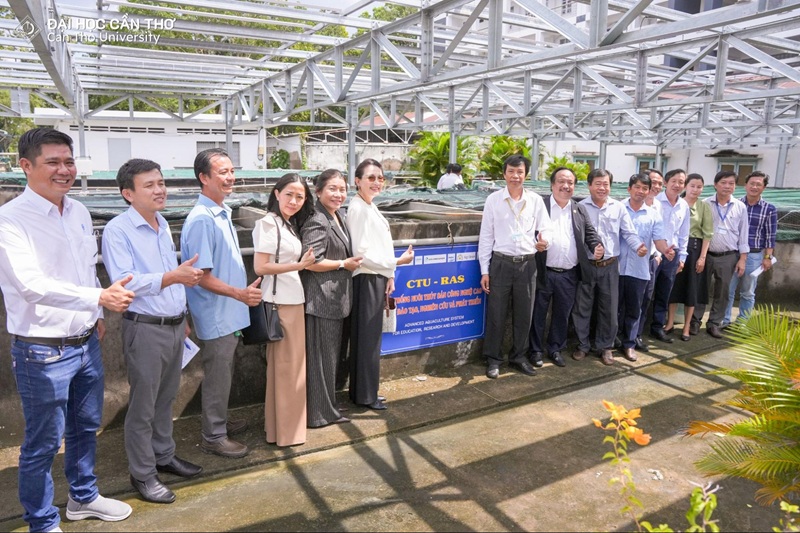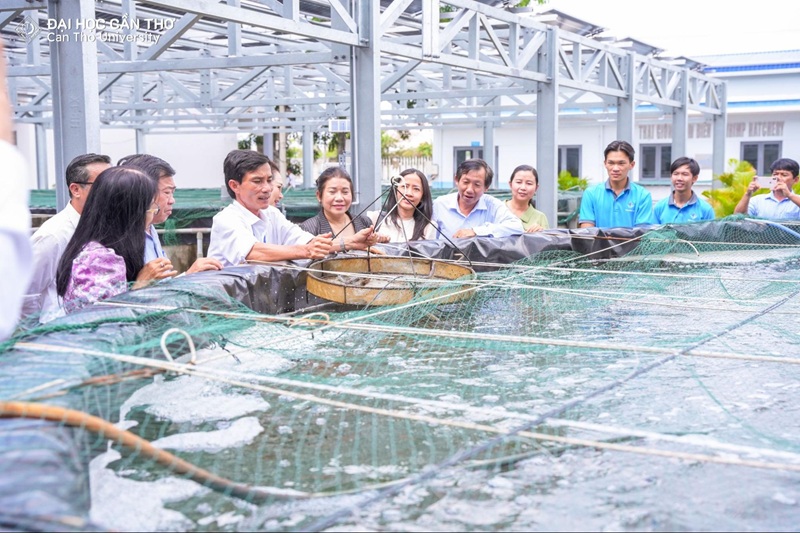 Các đại biểu tham quan mô hình nuôi tôm thẻ chân trắng siêu thâm trong hệ thống tuần hoàn kết hợp đa loài CTU-RAS tại Trường Thủy sản, ĐHCT