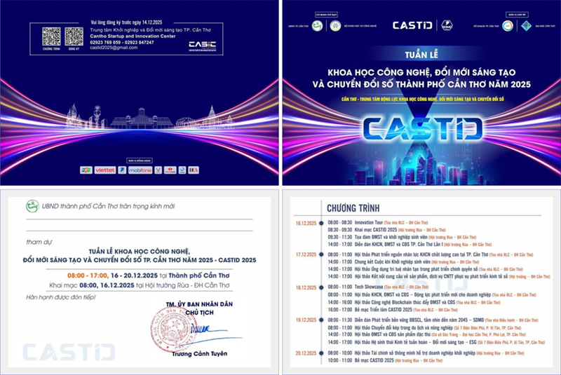 Thành phố Cần Thơ chính thức tổ chức Tuần lễ Khoa học Công nghệ, Đổi mới sáng tạo và Chuyển đổi số (CASTID 2025) từ ngày 16-20/12/2025. Với chủ đề “Cần Thơ – Trung tâm động lực khoa học công nghệ, đổi mới sáng tạo và chuyển đổi số”, sự kiện được tổ chức nhằm triển khai hiệu quả Nghị quyết số 57-NQ/TW ngày 22/12/2024 của Bộ Chính trị về đột phá phát triển KHCN,ĐMST&CĐS quốc gia; thúc đẩy nhận thức và ứng dụng đổi mới sáng tạo, chuyển đổi số sâu rộng trong mọi lĩnh vực kinh tế - xã hội của thành phố, hướng tới sự phát triển bền vững.