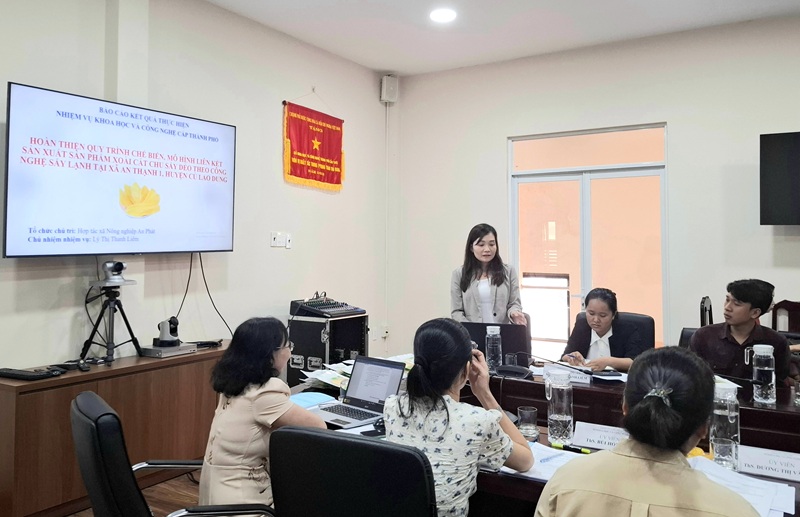 Tại cuộc họp, Ban chủ nhiệm dự án đã trình bày báo cáo tổng hợp kết quả triển khai, tập trung làm rõ quy trình công nghệ sấy lạnh xoài cát chu sấy dẻo, mô hình liên kết sản xuất giữa hợp tác xã và nông dân, cũng như hiệu quả kinh tế – kỹ thuật của sản phẩm.