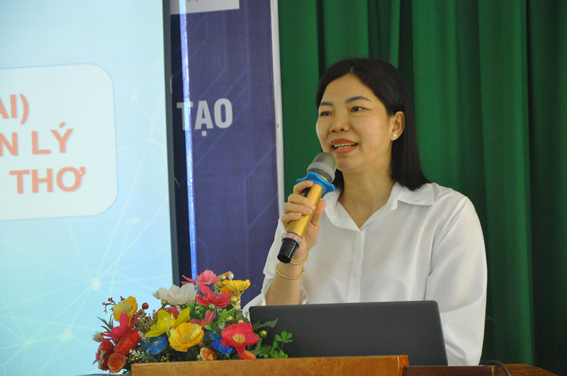 Thạc sĩ Cao Thị Hồng Tho, Phó Hiệu trưởng Trường Cao đẳng Nghề Cần Thơ, trình bày báo cáo về ứng dụng trí tuệ nhân tạo (AI) trong công tác quản trị, quản lý tại trường Cao đẳng nghề Cần Thơ.