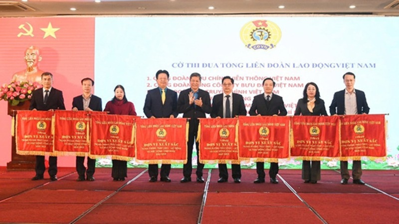 Tổng Liên đoàn Lao động Việt Nam trao Cờ thi đua toàn diện năm 2025 tặng 5 Công đoàn cơ sở và 3 Công đoàn cấp trên cơ sở.