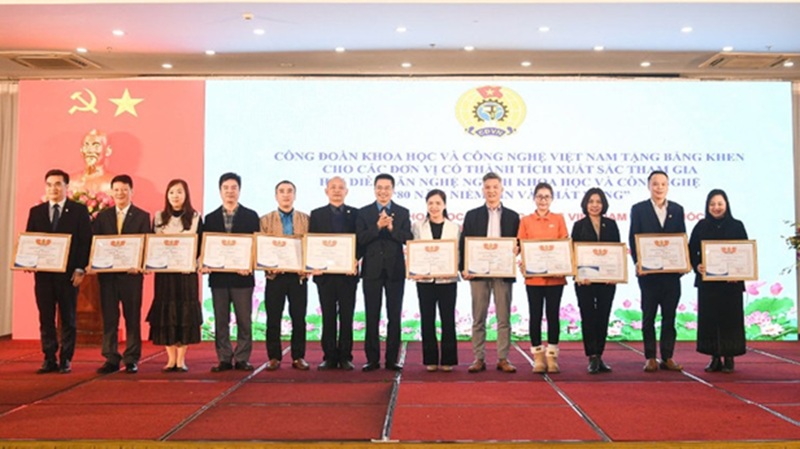Trao bằng khen của Công đoàn Khoa học và Công nghệ Việt Nam tặng các công đoàn cơ sở có thành tích trong tham gia Hội diễn văn nghệ.