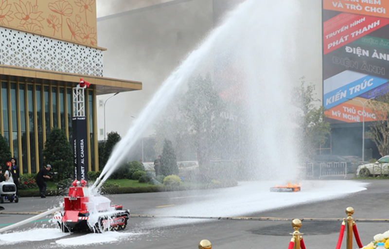Robot phòng cháy chữa cháy trình diễn tại Diễn đàn Quốc gia phát triển doanh nghiệp Công nghệ Việt Nam 2025 - Ảnh: VGP/TG