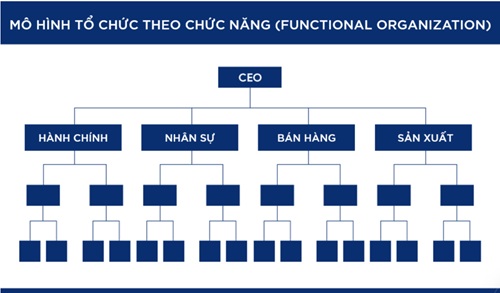 Ở cấu trúc này, doanh nghiệp được chia thành các phòng ban chuyên môn như marketing, tài chính, vận hành, nhân sự. Mỗi bộ phận do một nhà quản lý phụ trách và tập trung vào lĩnh vực riêng.