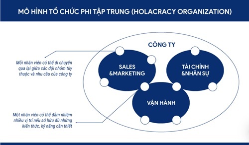 Holacracy là hình thức phân bổ quyền lực theo vai trò thay vì chức danh. Nhân viên có thể đảm nhiệm nhiều vai trò trong các “vòng tròn” công việc và tự quản lý nhiệm vụ của mình.