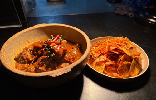 Trong khu bếp, các đầu bếp làm việc liên tục với nhiều chảo cùng lúc. Những nguyên liệu đặc trưng như thịt hun khói, lợn đen nuôi thả trên núi cao được chế biến ngay tại chỗ, sau đó bày biện trong các vật dụng như nồi đất thô, chảo đá mang phong cách dân gian. Không ít thực khách vừa lên món đã tranh thủ chụp ảnh, chia sẻ lên mạng xã hội và nhận xét rằng các món ăn trông vừa đẹp mắt lại vừa kích thích vị giác.