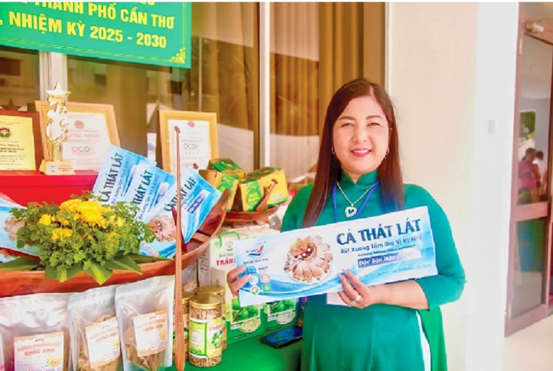 Bà Nguyễn Kim Thùy bên sản phẩm Cá thát lát rút xương tẩm gia vị Kỳ Như đạt chuẩn OCOP 5 sao cấp quốc gia. Ảnh: ĐANG THƯ