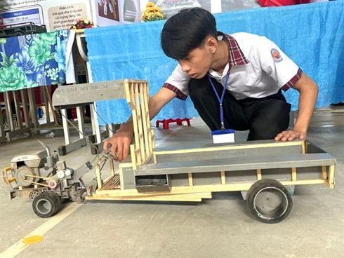 Mô hình xe công nông chạy động cơ bốn thì của em Y Duy Phong Niê, lớp 10A6, Trường THPT số 1 Nguyễn Trãi. Ảnh: TT