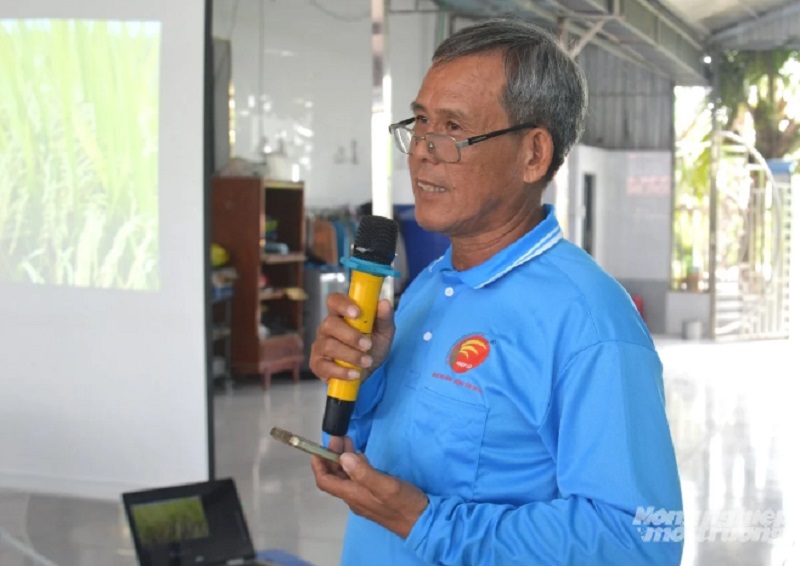 Ông Trình Thanh Danh, Chủ tịch HĐQT Hợp tác xã Nông nghiệp Hiệp Lợi trình bày về quá trình thực hiện mô hình canh tác lúa hữu cơ theo quy trình của Công ty S.U.D. Ảnh: Trung Chánh