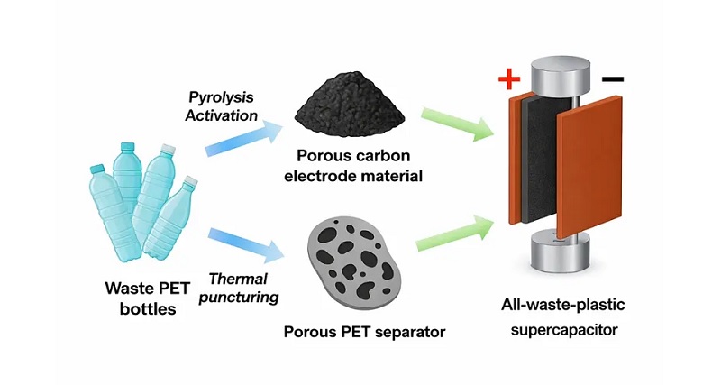 Những vật liệu tái chế đó kết hợp với nhau để tạo thành một siêu tụ điện hoàn toàn từ nhựa phế thải, được thiết kế để sạc nhanh và lưu trữ năng lượng lâu dài.