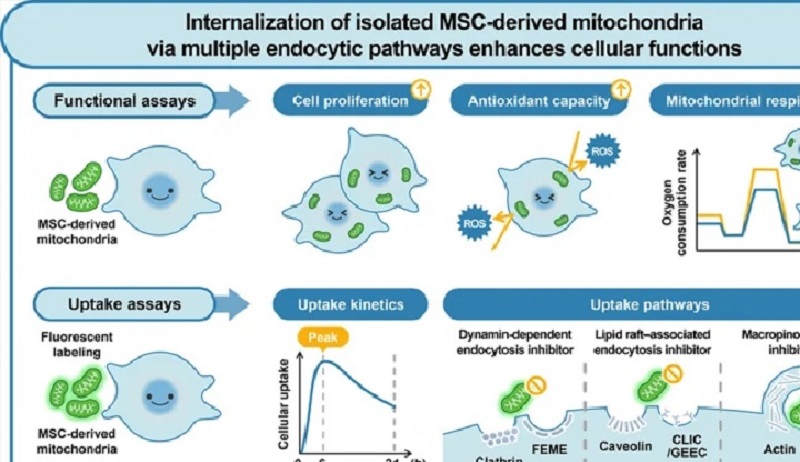 Để xác định xem những tác dụng này có cần các ty thể được cung cấp thực sự đi vào tế bào hay không, nhóm nghiên cứu đã theo dõi quá trình hấp thụ ty thể theo thời gian. Sử dụng kính hiển vi huỳnh quang, kính hiển vi confocal, phân tích tế bào dòng chảy và hình ảnh trực tiếp không cần chất đánh dấu, họ đã chứng minh rằng ty thể được tế bào gốc trung mô (MSC) hấp thụ dần dần trong vài giờ. Kính hiển vi điện tử cung cấp thêm bằng chứng xác nhận, cho thấy các cấu trúc giống ty thể được bao bọc bên trong các túi màng bên trong tế bào. Sau đó, bằng cách chặn có chọn lọc các con đường nội bào khác nhau, các nhà nghiên cứu đã chứng minh rằng MSC dựa vào nhiều cơ chế nội bào để hấp thụ ty thể, chứ không phải chỉ một con đường chủ đạo duy nhất.