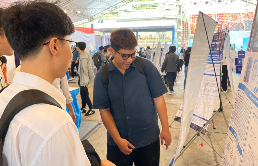 Sinh viên tham quan các poster giới thiệu ý tưởng thiết kế vi mạch. Ảnh: Hà An