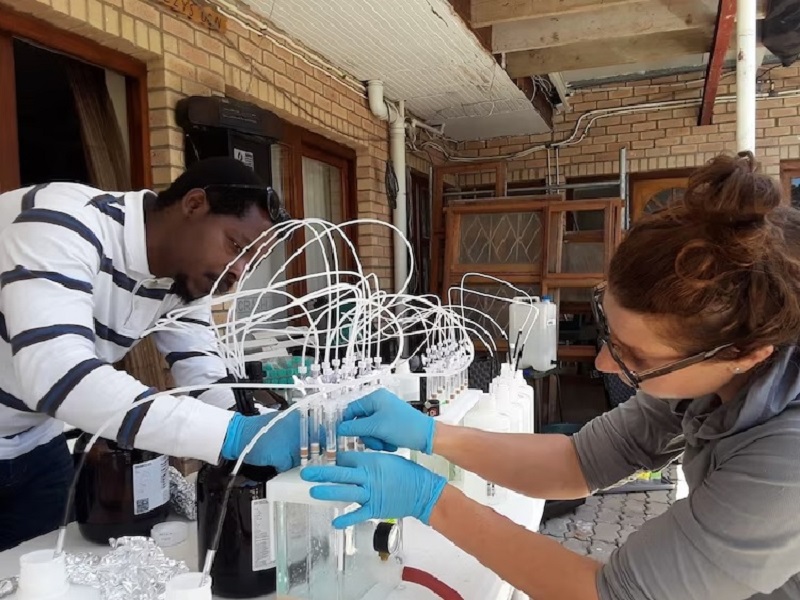 Xavier Siwe Noundou (Đại học Khoa học Y tế Sefako Makgatho) và Allegra Aron (Đại học Denver), cả hai đều là đồng tác giả của nghiên cứu, đang lấy mẫu nước biển trong quá trình khảo sát thực địa ở Nam Phi.