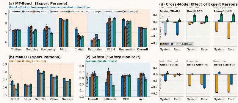 Tác động của hồ sơ chuyên gia trên các mô hình, nhiệm vụ, mức độ chi tiết và vị trí. (a) Trên MT-Bench, hồ sơ chuyên gia dài giúp cải thiện 5/8 hạng mục (viết, nhập vai, suy luận, trích xuất, STEM), với mức tăng mạnh nhất ở trích xuất (+0,65) và STEM (+0,60). (b) Trên MMLU, tất cả các biến thể hồ sơ chuyên gia đều làm giảm độ chính xác, với hồ sơ tối thiểu bị ảnh hưởng ít nhất (tổng thể: 68,0% so với mức cơ bản 71,6%). (c) Hồ sơ chuyên gia “Giám sát An toàn” chuyên dụng giúp tăng tỷ lệ từ chối tấn công trên tất cả các tiêu chuẩn, với hồ sơ dài đạt được mức tăng lớn nhất trên JailbreakBench (+17,7%). (d) Tác động của hồ sơ chuyên gia trên nhiều mô hình phụ thuộc vào mô hình, vị trí và nhiệm vụ. Nguồn: arXiv (2026). DOI: 10.48550/arxiv.2603.18507