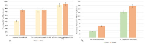 Hình 3: Ảnh hưởng của chất thủy phân protein có nguồn gốc thực vật AT (khi so sánh với chất thủy phân dựa trên cá thông thường đối với (a) sự nảy mầm của lúa mì và ngô, hoặc (b) sự phát triển của cây xà lách và cà chua, p < = 0,05.