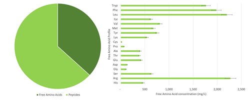 Chất thủy phân protein có nguồn gốc thực vật của Agri Technovation (AT) đã được thử nghiệm rộng rãi và đặc trưng để đảm bảo chất lượng nhất quán. Quy trình độc quyền liên quan đến một số enzyme chuyên biệt khác nhau và sơ đồ xử lý tổng thể và các biến quy trình đã được tối ưu hóa trên quy mô dự bị, thí điểm và thương mại. Quá trình này tạo ra các chiết xuất có chứa cả axit amin tự do và peptide hoạt tính sinh học được xác định bằng phân tích khối phổ, cho thấy sự pha trộn phong phú của các axit amin bao gồm hàm lượng arginine, tryptophan, phenylalanine và leucine cao (Hình 2; Bảng 1).