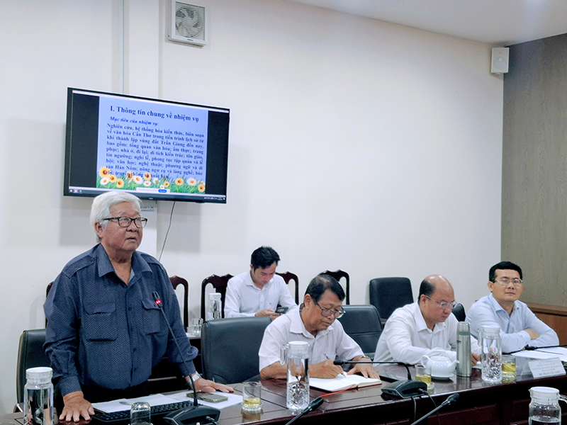 Tại buổi họp, Ban chủ nhiệm đề tài đã trình bày tóm tắt quá trình triển khai và các kết quả đạt được. Theo đó, đề tài được thực hiện nhằm nghiên cứu, hệ thống hóa kiến thức, biên soạn về văn hóa Cần Thơ trong tiến trình lịch sử từ khi thành lập vùng đất Trấn Giang đến nay, bao gồm: tổng quan văn hóa; ẩm thực; trang phục; nhà ở, đi lại; di tích kiến trúc; tôn giáo, tín ngưỡng; nghi lễ, phong tục tập quán và lễ hội; văn học; nghệ thuật; phương ngữ và di sản Hán Nôm; nông ngư cụ và làng nghề; báo chí; truyền thông và xuất bản.
