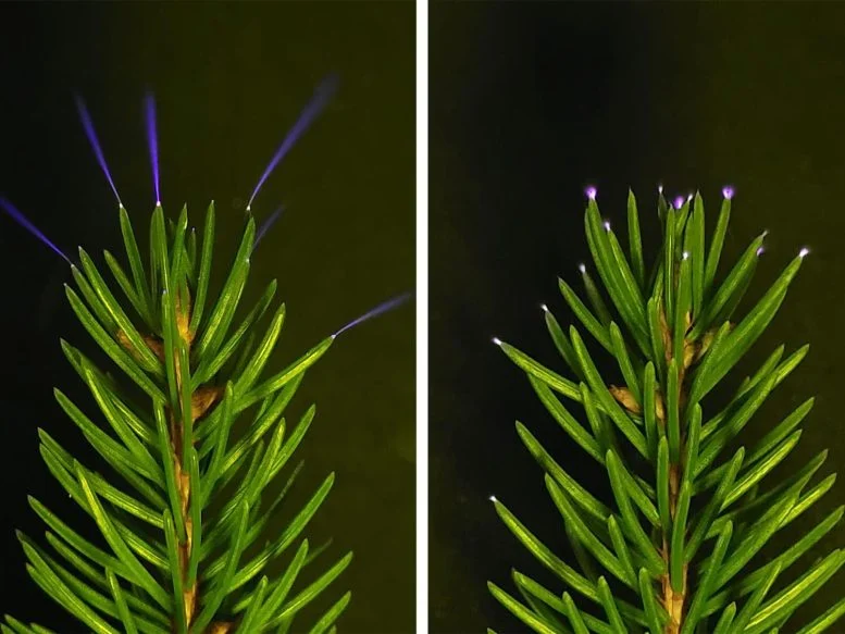 Trong cơn giông, mây tích điện âm hút điện tích dương từ mặt đất. Dòng điện này đi lên qua thân cây, tập trung ở đầu lá – nơi điện trường mạnh đến mức tạo ra ánh sáng mờ trong phổ nhìn thấy và UV. Tia UV này phá vỡ hơi nước, sinh ra hydroxyl (OH) – chất oxy hóa chính trong khí quyển, có khả năng “làm sạch” không khí bằng cách phản ứng với khí thải từ cây và các chất ô nhiễm do con người tạo ra, kể cả methane – một loại khí nhà kính.